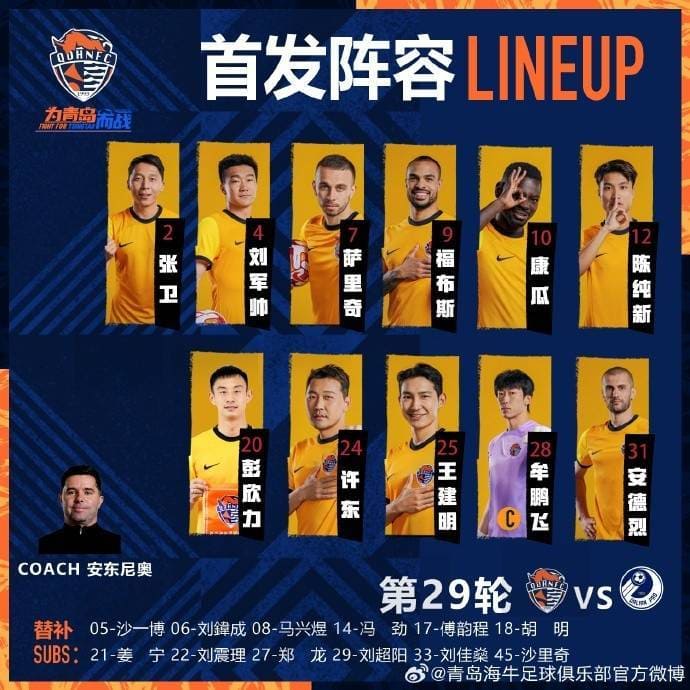 棋牌游戏真人-青岛海牛vs大连人首发:双方均4外援出战 林良铭替补待命